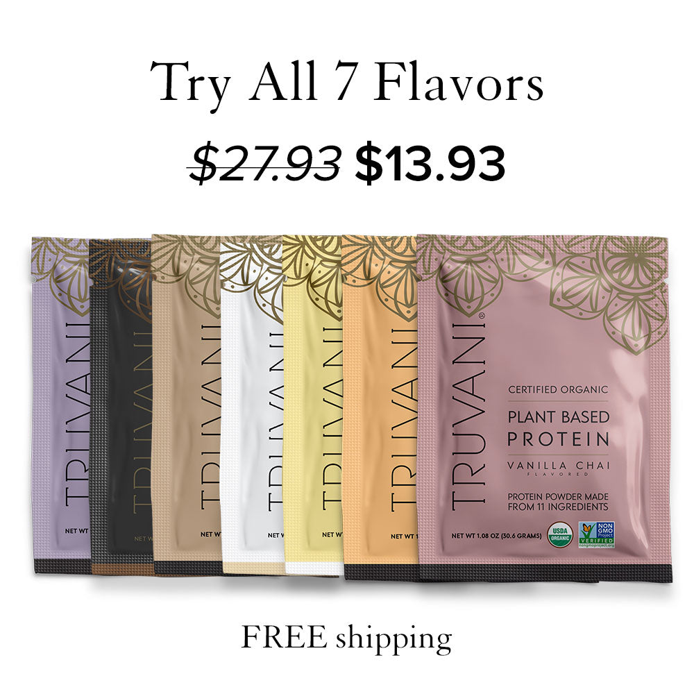 Get all 7 samples of every flavor of our plant-based protein powder for just $13.93 ($27.93 Value). We’ll even ship it to you for free! All you need to do is join our text list.