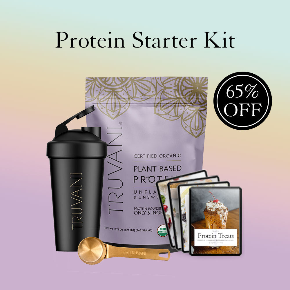 Get our Protein Starter Kit at 65% OFF: 1 full-size bag of protein powder, our stainless steel shaker cup, gold protein scoop, and 4 recipe eBooks.