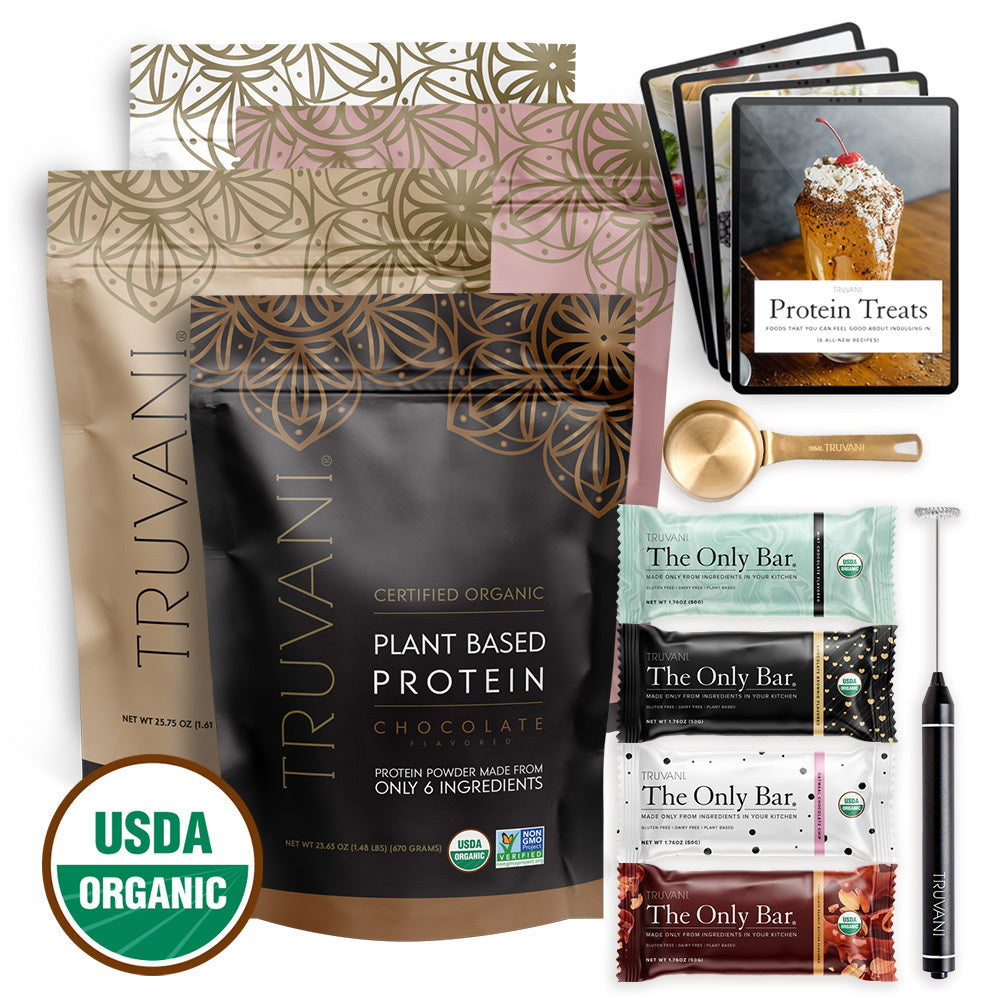 What if you could reap all the amazing benefits of protein intake, while enjoying a deolicious organic shake? Or muffin? Or pancakes? Now you can, with Truvani’s Premium Protein Starter Kit: a 20-serving bag, a powerful electric handheld frother, a golden scoop, 4 USDA Organic Truvani Snack Bars, and recipe guides to get you started.