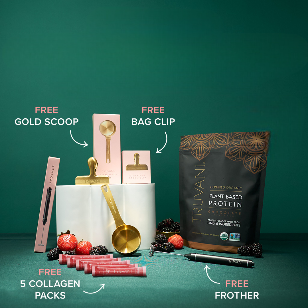 What if you could reap all the amazing benefits of protein intake, while enjoying a delicious organic shake? Or muffin? Or pancakes? Now you can, with Truvani’s Premium Protein Starter Kit: a 20-serving bag, a powerful electric handheld frother, a golden scoop, a golden clip, 5 Collagen Peptide Stick Packs, and recipe guides to get you started.